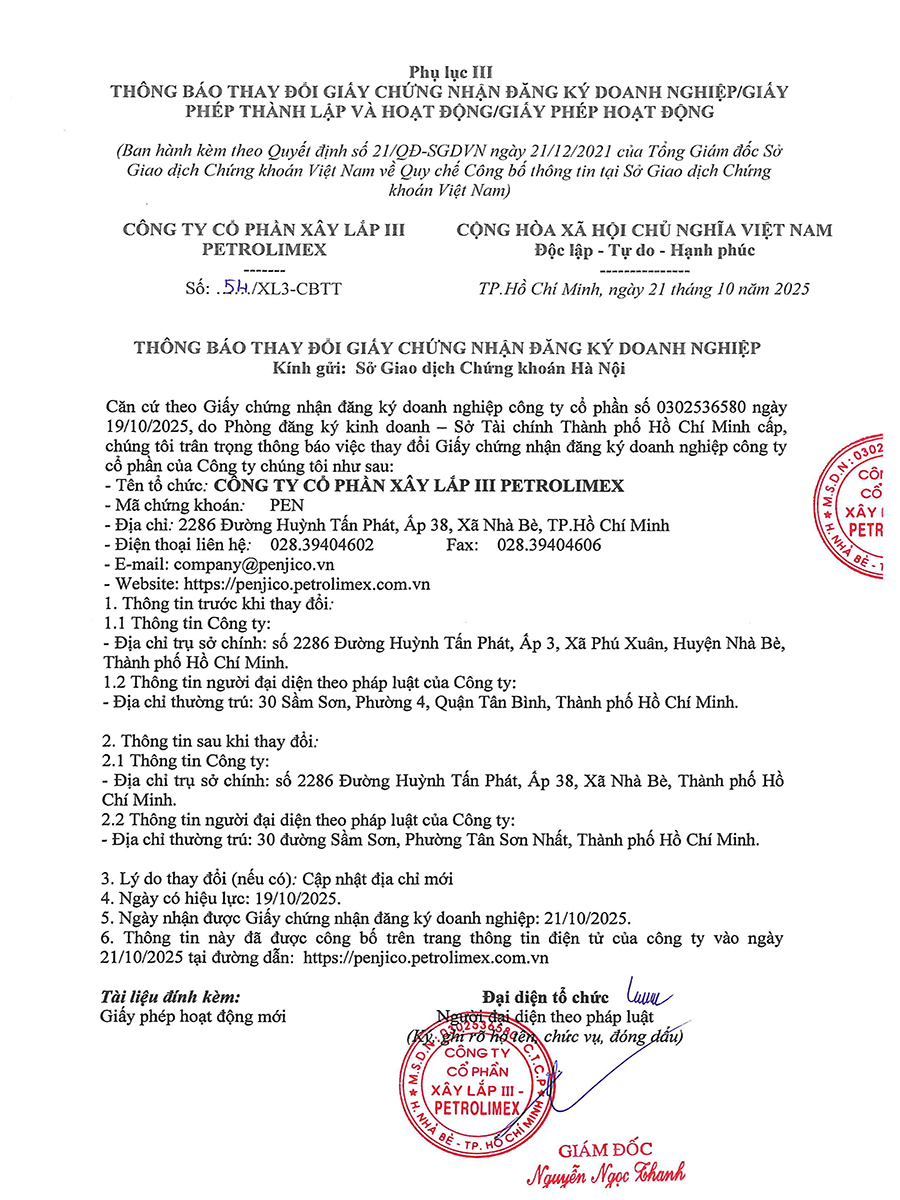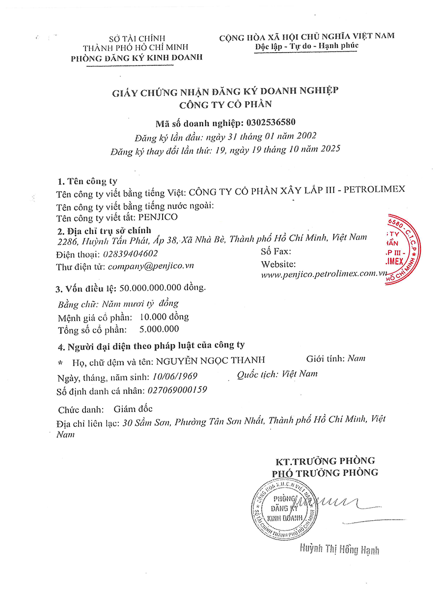 Thông báo thay đổi giấy chứng nhận đăng ký kinh doanh lần thứ 19, ngày 19/10/2025